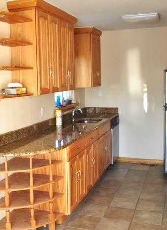 Home remodeling: Kitchen Remodel-New Cabinets, counters, appliances, tile and custom-built shelves.